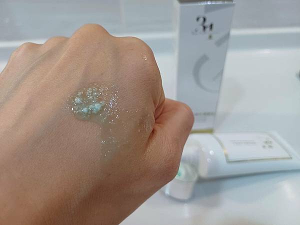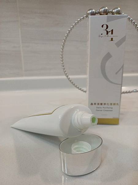 「晶萃深層淨化潔顏乳」淡綠色帶有微粒,